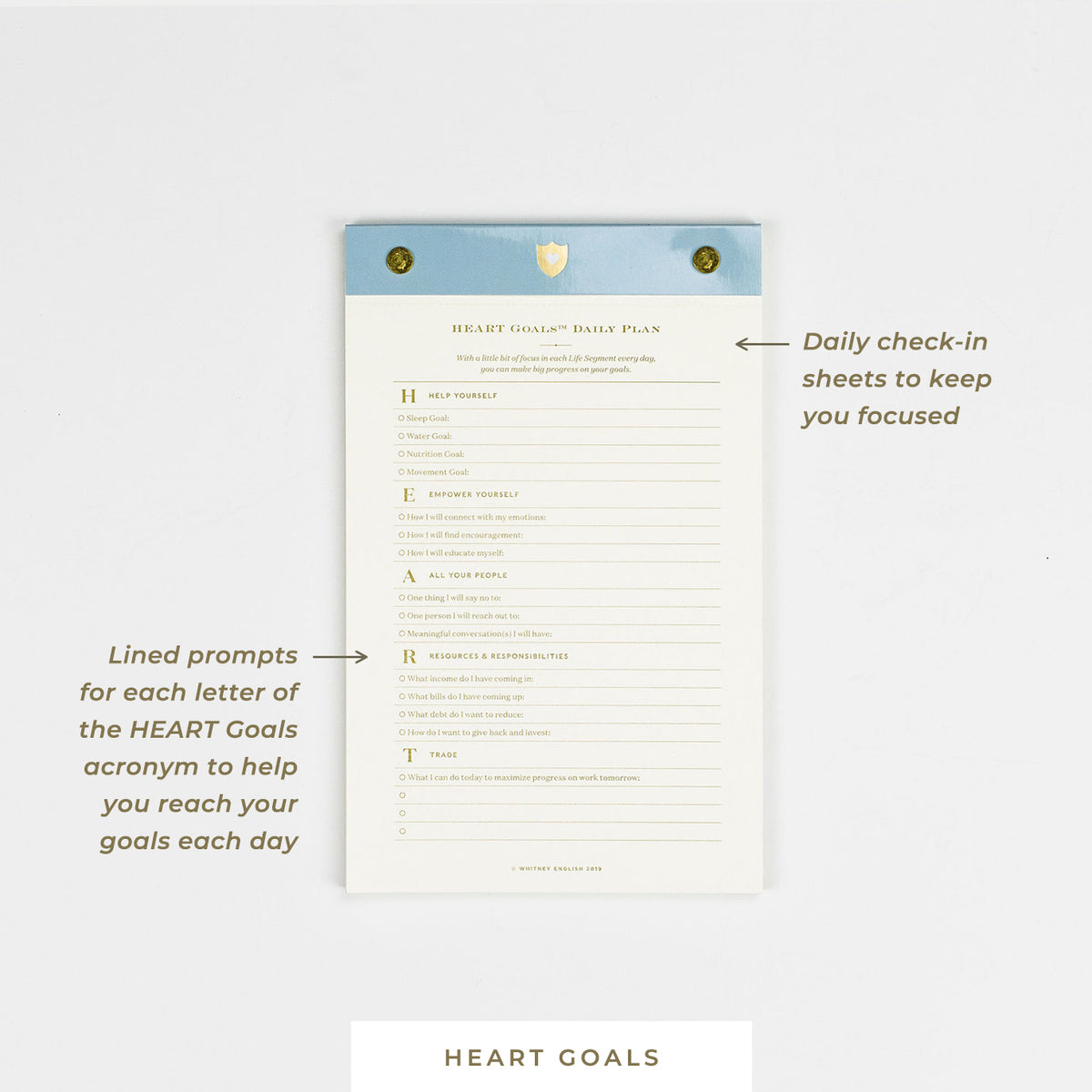 HEART Goals™, the personal goal-setting system by Whitney English, is a process for removing all obstacles to achieving your goals. It’s a framework for prioritizing and decision-making. This notepad helps you run through the HEART Goals acronym to make sure you are living balanced!